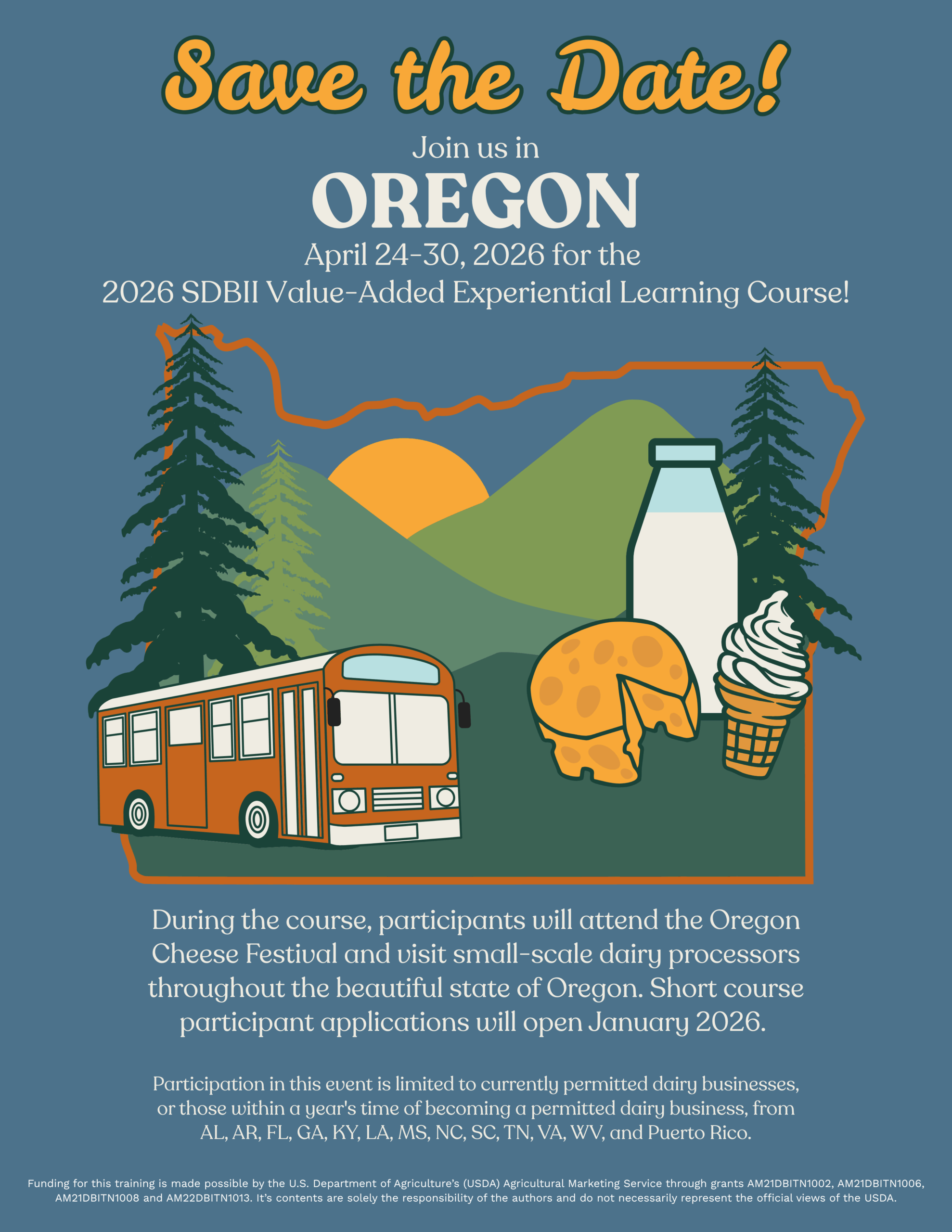 We are thrilled to hold our annual SDBII Value-Added Experiential Learning Course in Oregon in April 2026! During the course, participants will attend the Oregon Cheese Festival and visit small-scale dairy processors throughout the beautiful state of Oregon. Scholarships will be available to participation to defray the cost of lodging and travel, and applications to participate will be open in January 2026.