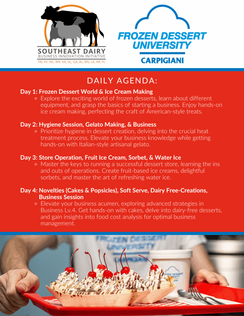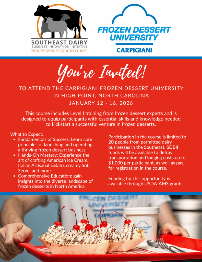 Through USDA Dairy Business Innovation Initiative resources, UT’s Center for Dairy Advancement and Sustainability is pleased to provide stipends to assist value-added dairy producers or key personnel in the Southeast Region (Alabama, Arkansas, Florida, Georgia, Kentucky, Louisiana, Mississippi, North Carolina, Puerto Rico, South Carolina, Tennessee, Virginia, and West Virginia) to participate in a special cohort of the Carpigiani Frozen Dessert University in High point, North Carolina January 12 – 16, 2026. Selected individuals will be reimbursed up to $1,000 to help defray registration and selected travel expenses for travel and lodging.